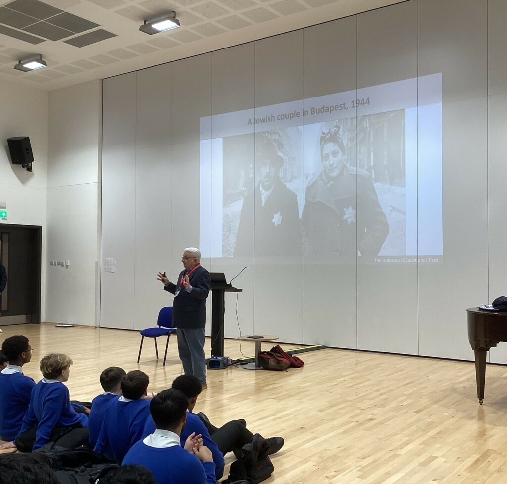On Holocaust Memorial Day, we were honoured to welcome Paul Sved, who spent his childhood in Hungary during the 1940s and 1950s. Paul spoke to our Year 9 students about his experiences during the Nazi occupation, describing how he and his mother were first forced into a ghetto before obtaining false papers that allowed them to move into a Swiss safe house known as the Glass House. When it became clear that even this refuge would not remain safe, his mother secured shelter for them in the basement of a local family’s home.