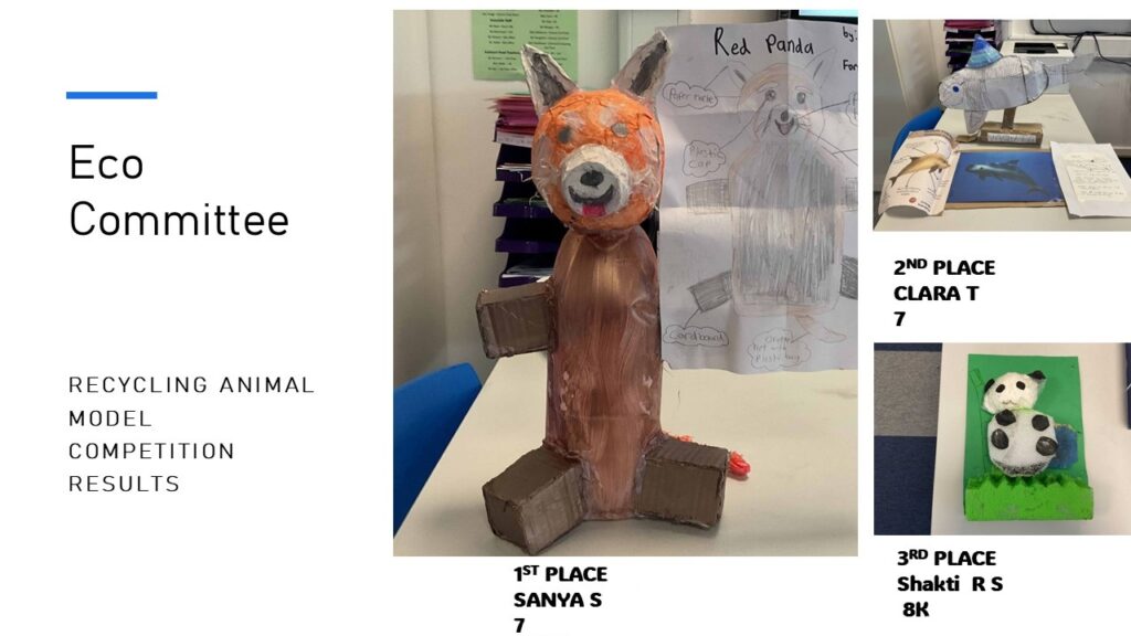 Last term, our Eco-Committee ran a house competition which challenged students to design and make a model of an endangered animal using only recyclable materials. Entries were judged by members of the Eco-Committee who were impressed with the creativity and imagination demonstrated. Congratulations to Sanya in Year 7 who was awarded 1st prize for a fantastic red panda and to runners up Clara and Shaki, well done to you all!