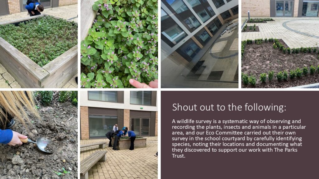To support their work with The Parks Trust, members of our Eco-Committee recently conducted a wildlife survey to identify and record plants, insects and animals in the school courtyard. Through this activity, students enhanced their understanding of biodiversity, ecosystems, and the importance of the food chain, developed valuable teamwork, problem-solving, and communication skills while promoting mental wellbeing by connecting with nature in an outdoor setting.